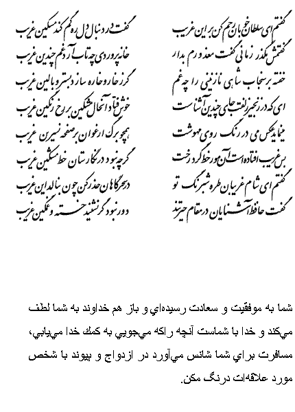 ای حافظ شیرازی ، تو را قسم می دهم به خداوند متعال و به همان شاخ نباتت که در شعرهایت نیز سرودی ، که هرچه مصلحت می بینی را برایم آشکار کرده و آرزوی مرا برآورده سازی.